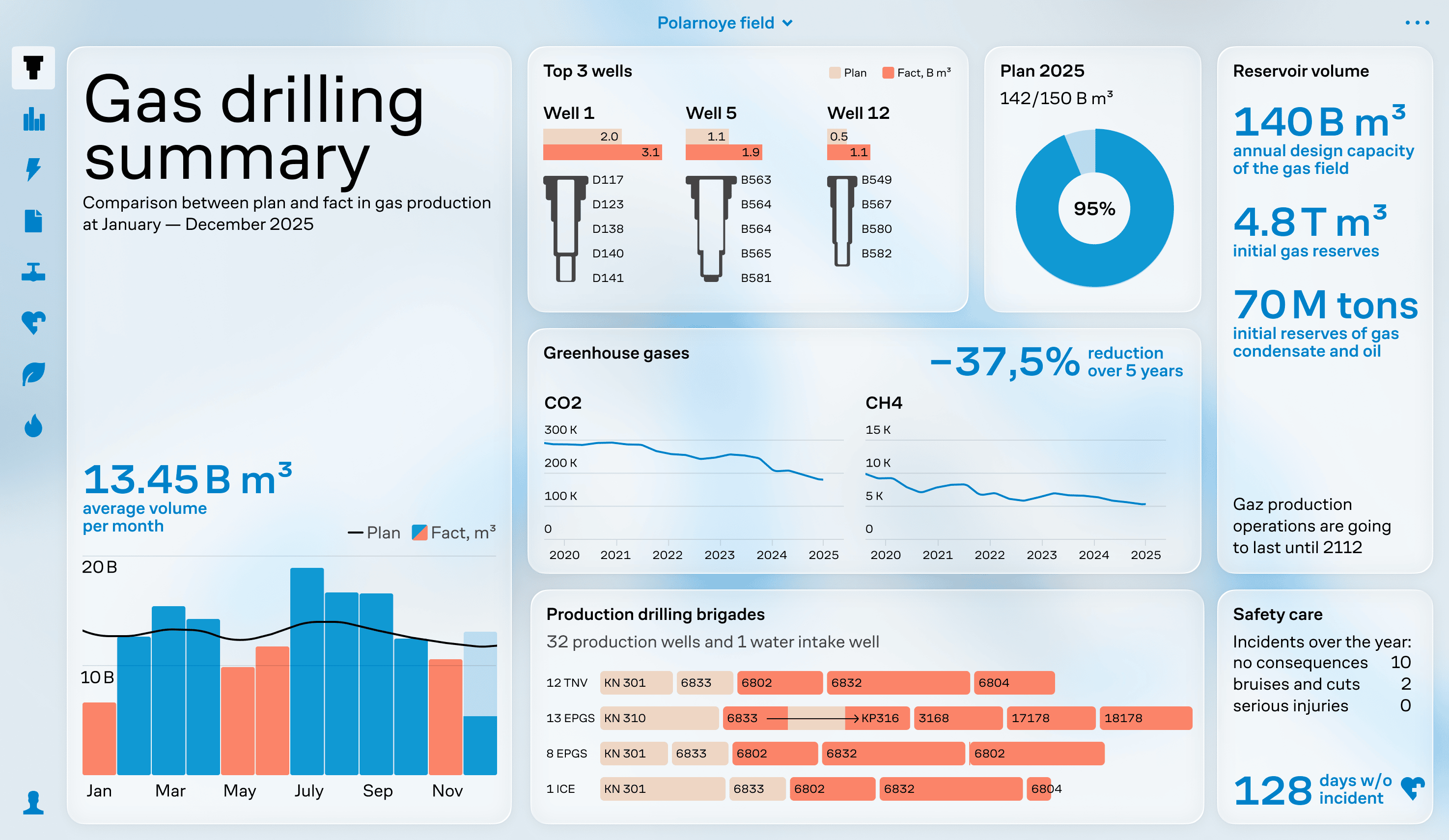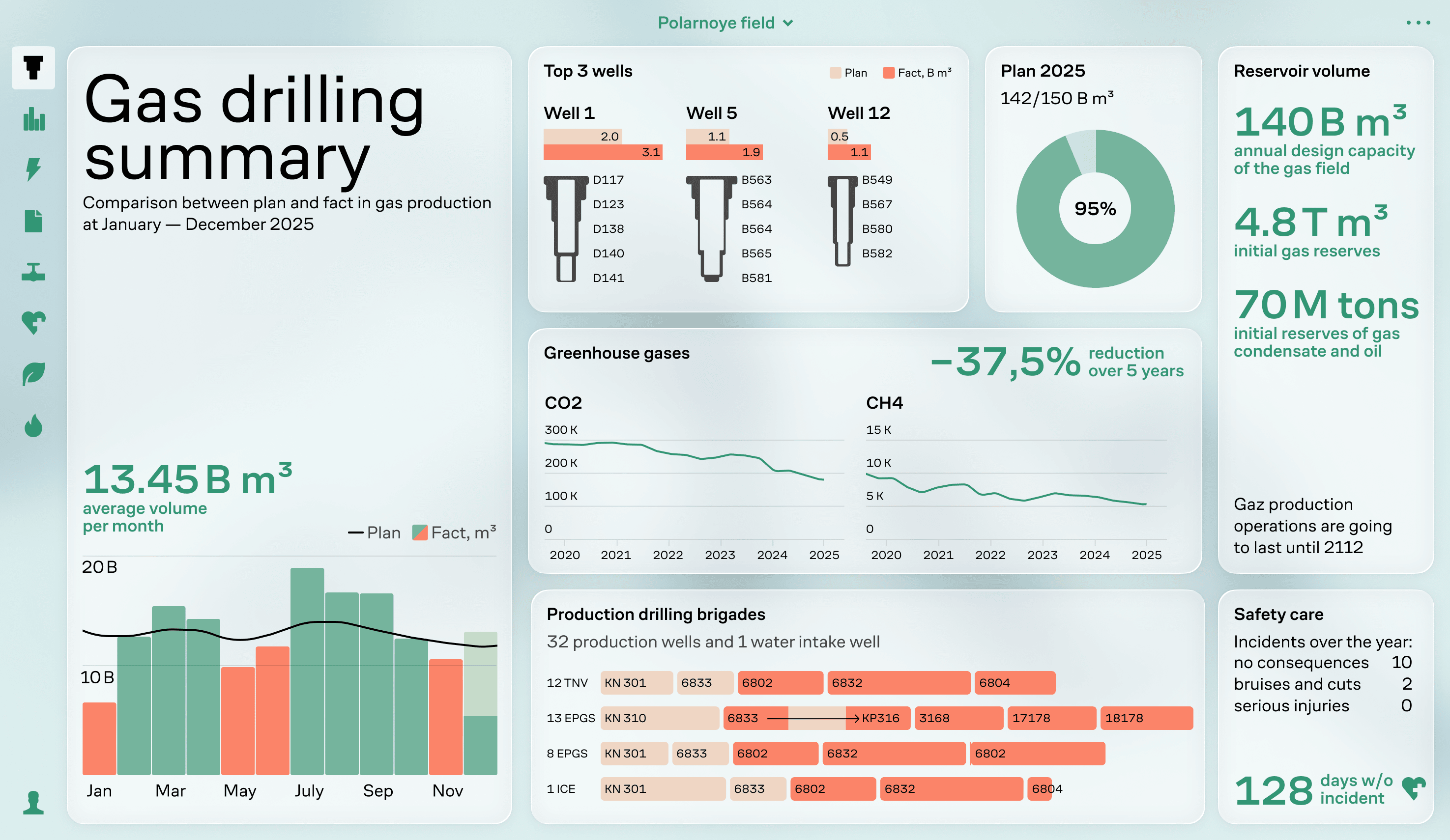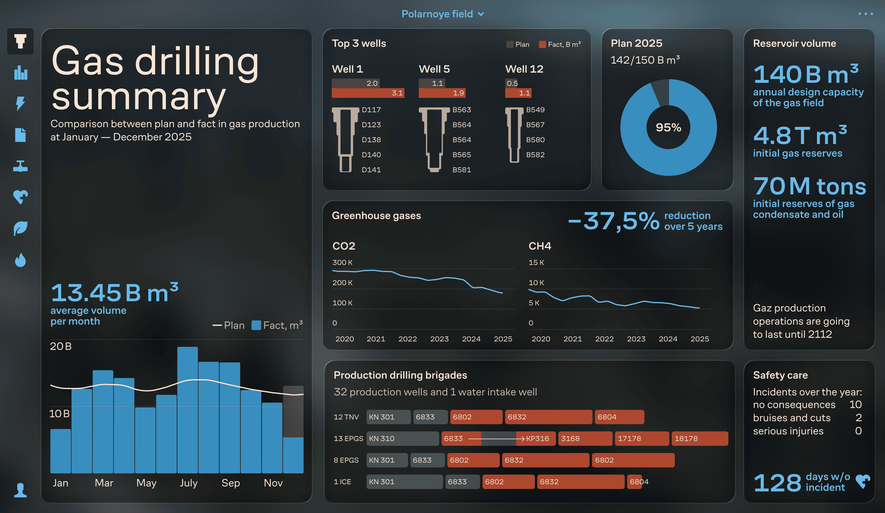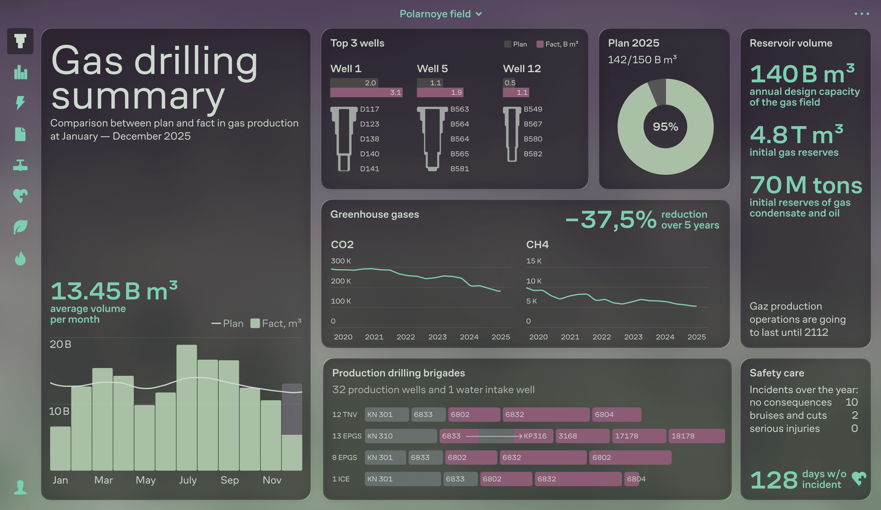 Концепт демонстрирует нефтяные и газовые месторождения, а также статистику по добыче полезных ископаемых, выполнению плана, экологическом влиянии и безопасности производства.