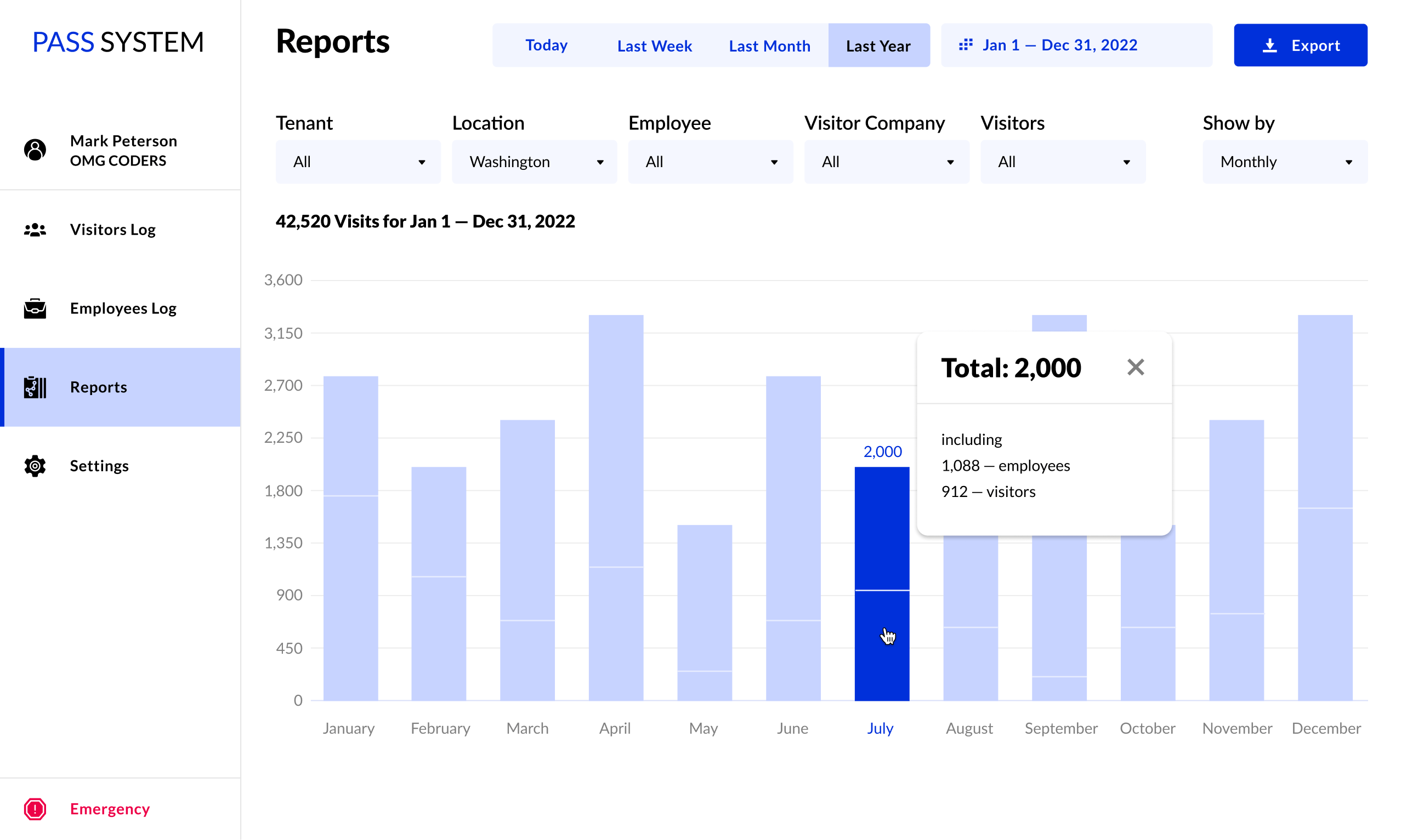 Система формирует отчеты о количестве посетителей. Статистика фильтруется по компаниям, сотрудникам, времени посещения.