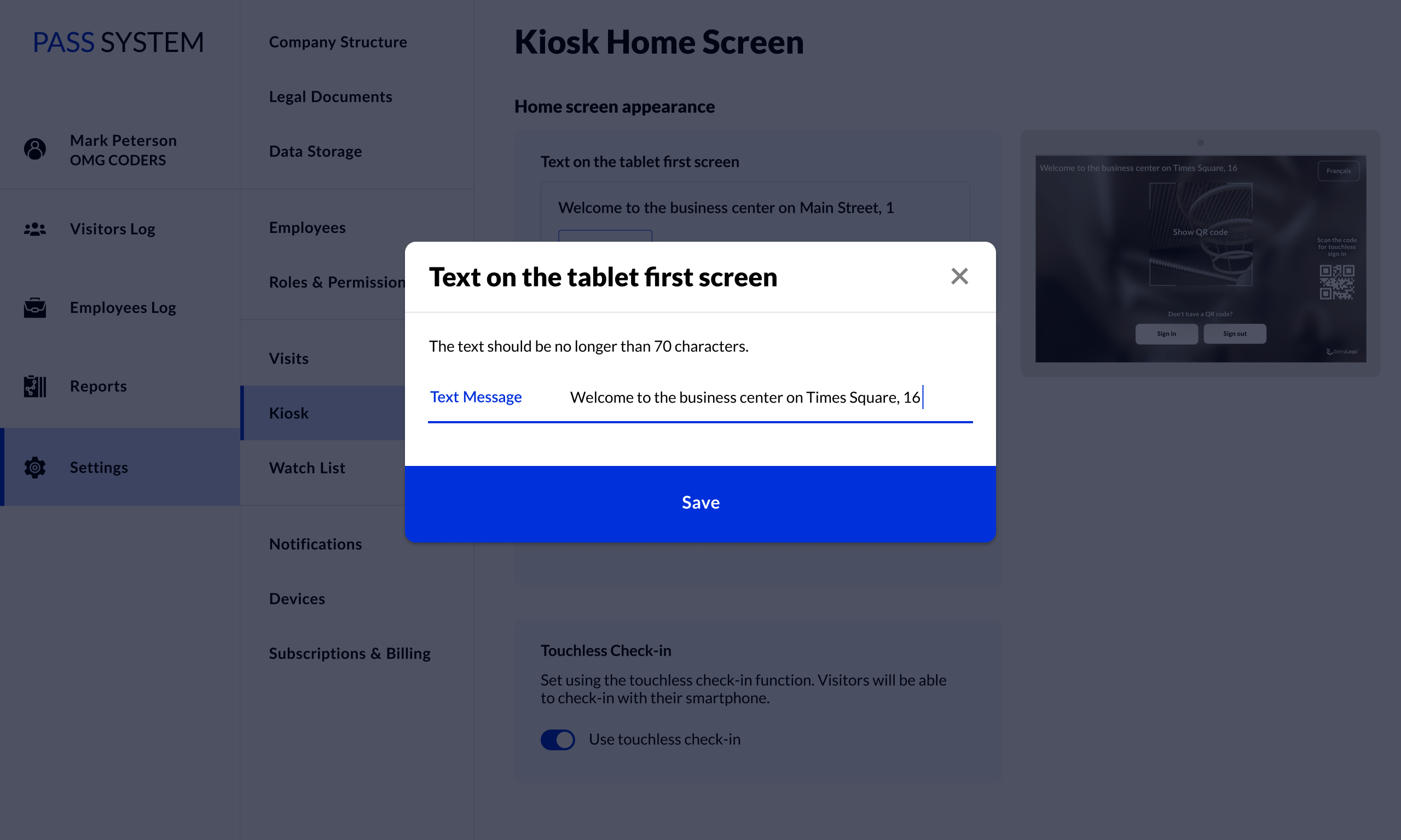 Компании подстраивают систему под себя в зависимости от пропускного режима. Настраивают требования к данным гостей, разрешают или нет повторный вход, редактируют приветствие на терминале и настраивают уведомления.