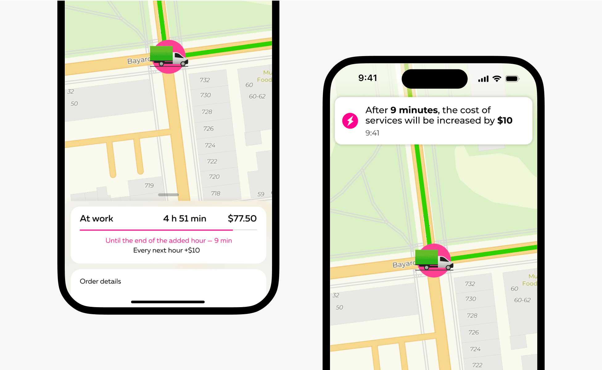 На случай, если клиенту понадобится больше времени на заказ, приложение показывает стоимость дополнительного часа.