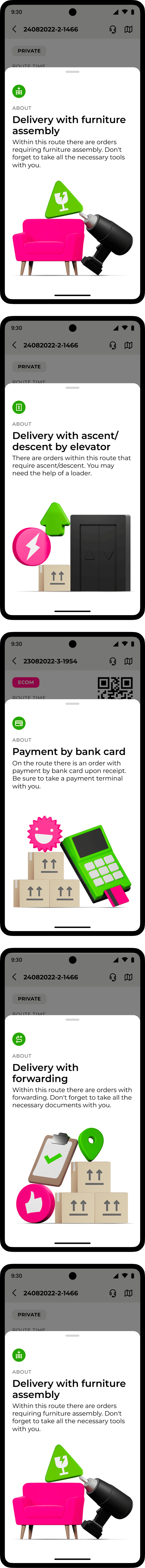 В разделе маршрутов водитель берёт доставку, выполняет инструкции по загрузке и следует по маршруту: