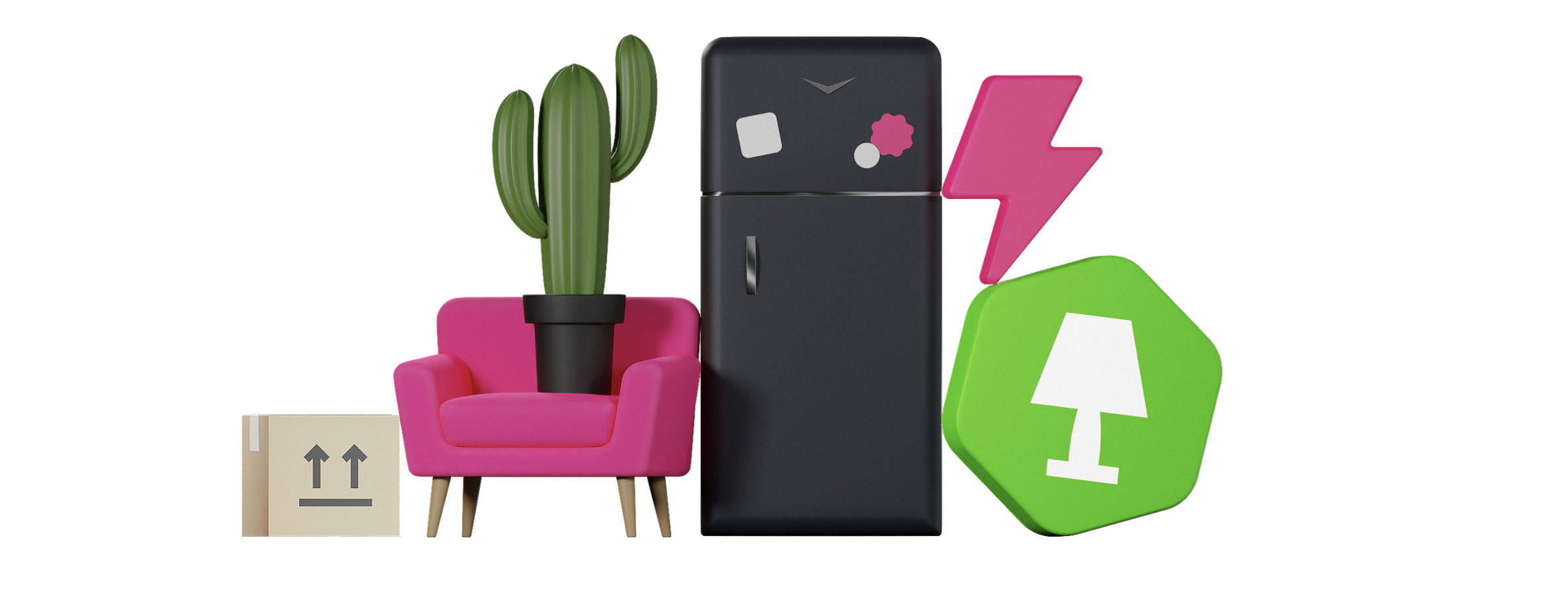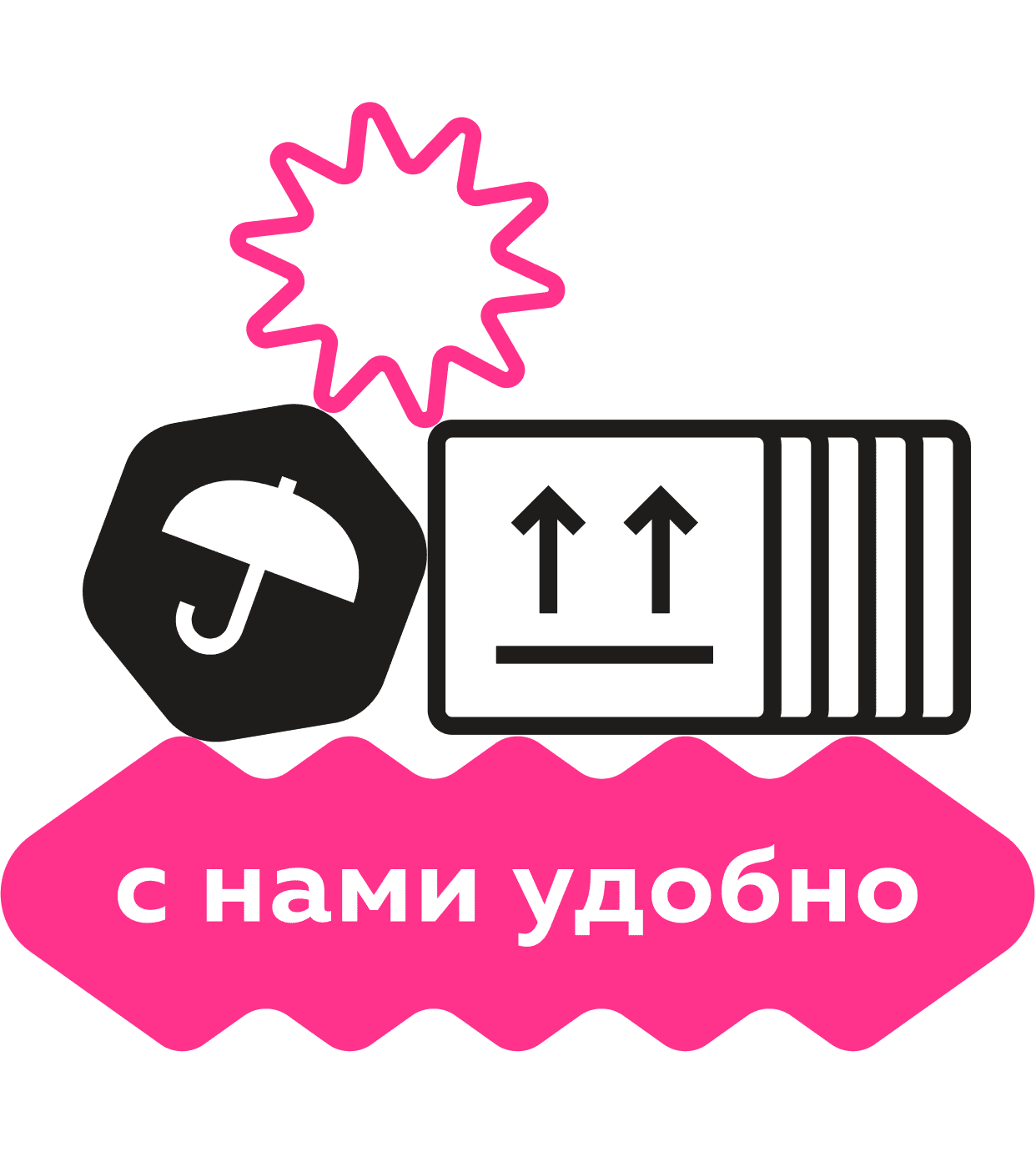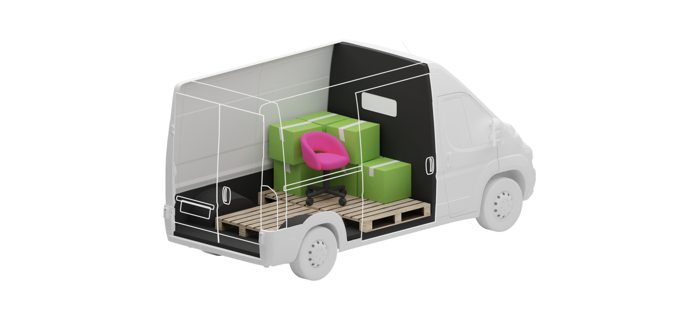 Форма логотипа и графические элементы появились из реальных вещей: мебели, техники и упаковки. Они укладываются друг на друга, как вещи в грузовой машине.