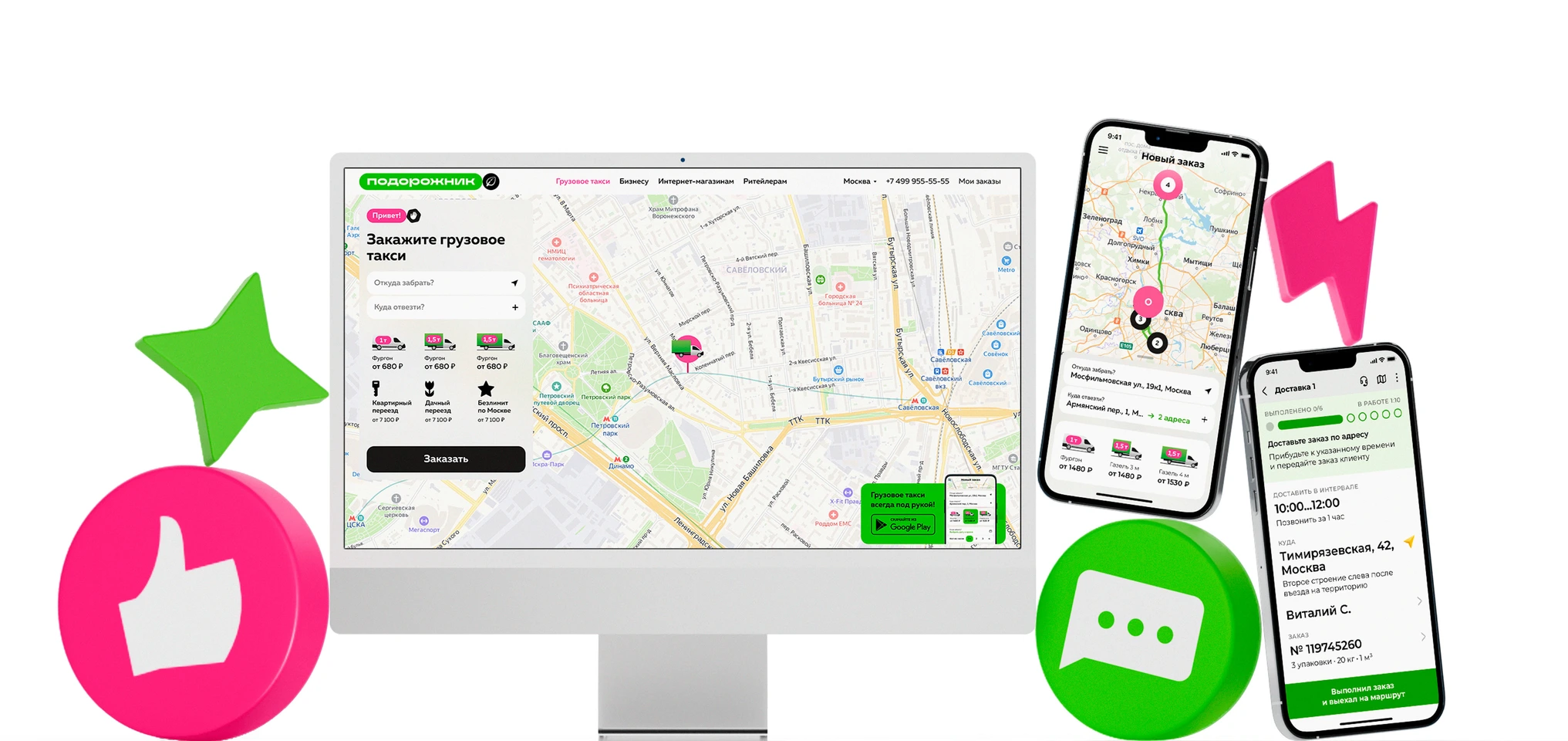 Мы задизайнили сайт и приложение для заказа грузового такси. Клиенты выбирают машину, тариф и видят маршрут доставки в реальном времени.